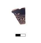| Description: | Single fragment, broken all around. Preserves single palmette from shoulder frieze. Right facing palmette with six fronds, each divided by single line, two symmetrical curlicues and tendril with curlicue sprouting from center. Two arcs and central dot for heart. Above two reserved lines, upper with added red overlayed. Relief line: outline of palmettes except interior of curlicue; details of palmette except dividing line of fronds and central dot; lower edge of each reserved line. Interior unglazed. | |