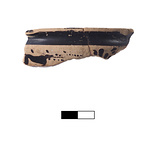Black glazed rim. Quadraped, possibly a lion or cow (no incision) between palmettes, branches in field. Reserved line on interior of lip. Roughly made. Rim pinched and distorted in places.