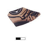 | Description: | Single wall fragment, broken all around. Preserves half of circular black glazed eye formed by three concentric incised lines within thick black glaze eye-shaped outline, with tear duct at lower right. To right, rear portion of chariot wheeling around and back legs of horses. Branch with leaves painted over top of chariot. Incision for horse legs. Below, thin and thick dilute lines, black glaze band. Added white: iris of eye, patch on chariot or horse. Well potted, good black glaze. | |