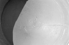 | Description: | Western Sigillata bowl broken but nearly complete. Low flaring base ring; gently concave floor; almost vertical side wall. Four grooves on the outside of the side wall. On the floor inside, traces of a stamp. Yellow clay; thin red glaze inside and out. | |