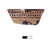 | Description: | Two joining fragments of rim and wall. Concave rim with degenerate dot-band. Below, dilute band, then second row of dots, then band. Dilute glaze line at top of figural zone, which preserves head to left, with incision for eye and brow. At right, back of head to right. No added color preserved. Reserved line on interior of rim. Poorly made. Scrape on rim and dent at top of figural zone. | |