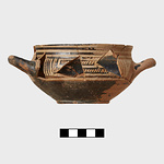 | Description: | Mended from many fragments; complete except for part of rim and gaps in body. Black paint unevenly worn, with only traces on one side, revealing clearly the beige slip on reserved area. Fairly deep, globular shape, with slightly everted, tall vertical lip; ring foot. Exterior decoration: three broad stripes on rim wall; shoulder panels between handles, of broad hatched maeander framed by four vertical lines, with rosettes in upper angle between panel and handle zone; lower wall, foot and resting surface painted solid, as are horizontal handles. Reserved: inside of handles, handle panels and underside of foot. Interior painted solid except for reserved band on inner lip and large dot at bottom of center. Buff fabric, with black glaze. Middle Geometric II. ADDENDA: Two joining body fragments added from Lot ΜΣ 508, not mended (Dec. 2020). See Coldstream (1968) pl. 5e (= Kerameikos V.I, no. 294, and p. 23; first or second third of 8th century BC.) | |