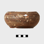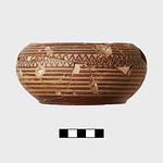 | Description: | Mended from many fragments preserving almost complete vessel, with single small lid fragment. Well preserved paint fired reddish brown. "Flat pyxis" of MG I type, with "vigorously curved profile". Inset rim, with corresponding pairs of suspension holes. Top of rim painted solid. Interior and underside of foot reserved. Exterior decoration: broad band above base, above which body divided into two sets of horizontal bands (seven below, five on top), with double zigzag pattern between at shoulder level. Lid fragment decorated with reserved bands, with reserved underside. Pinkish buff clay with large inclusions. Middle Geometric I. See Kerameikos V.I, no. 262 (= Coldstream (1968), pl. 3f); and generally Coldstream, p. 17. Ca. 800 B.C. ADDENDA: One joining body fragment added from Lot ΜΣ 508, not mended (Dec. 2020). ADDENDA:This fragment now is recorded as P 38588, because according to Bartek Lis they do not belong together (March 2022). | |