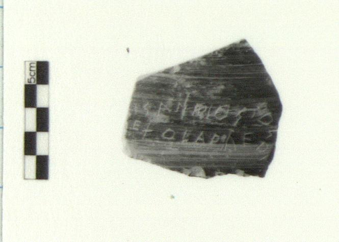 | Description: | Single wall fragment broken all around. Streaky glaze, worn. Body sherd of a closed coarse-ware vessel glazed with thin dark brown glaze on exterior only. Inscribed on exterior, fairly deep letters, name of Xanthippos and his demotic (rare). <graphic> Pinkish-orange semi-fine fabric Cf. Agora XXV, nos. 1053-1069 c. 484 B.C. | |