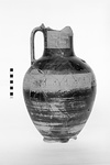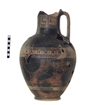 Description:   Mended from many fragments. Missing rim, one handle, and fragments from the body. Dull black streaky glaze with patches of red on one side. Flaring ring foot, ovoid body with high center of gravity, and strap handle running from high on neck to shoulder. Whole surface painted solid except for narrow zone on lower body near foot decorated with two horizontal bands, and a larger one below shoulder with double axes separated by rows of ten vertical lines enclosed between triple bands. Reserved panels on neck, with hatched maeander framed above and below by two black bands. Reserved: underside and resting surface; inside and striped outside of handle.