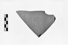 Description:   Single roughly triangular fragment preserving section of wall of large closed vessel. Broken all around.