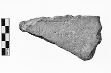 Description:   Triangular coarseware wall fragment, broken all around. Inscribed on exterior surface name of Xanthippos. No patronymic or demotic: <graphic>