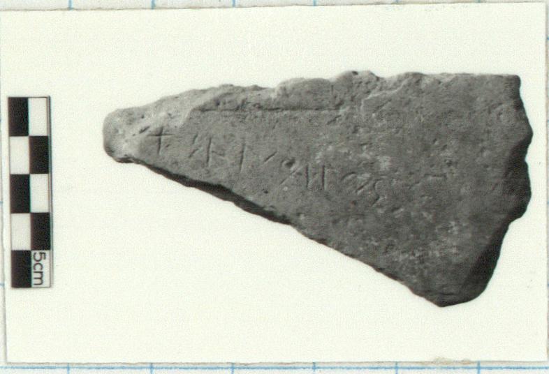 | Description: | Triangular coarseware wall fragment, broken all around. Inscribed on exterior surface name of Xanthippos. No patronymic or demotic: <graphic> Light yellowish-brown clay with white and brown inclusions. Cf. Agora XXV, nos. 1053-1069. | |