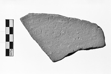 | Description: | Single wall fragment of large unglazed coarseware vessel, broken all around. Incised letters, left to right, give name and (misspelled) demotic of Themistokles. <graphic> Orange fabric, coarse grained, white inclusions. | |