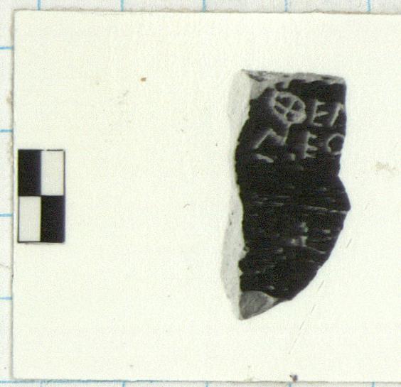| Description: | Single fragment, broken all around. Incised letters on glazed interior preserve part of name and patronymic of Themistokles: <graphic> Orange fabric, black glaze. Joins P 32950. | |