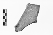 | Description: | Single wall fragment of large coarseware vessel with dark brown glaze on inside only. Incised letters on exterior, on two lines: <graphic> Light brownish-orange fabric, dark brown glaze. | |