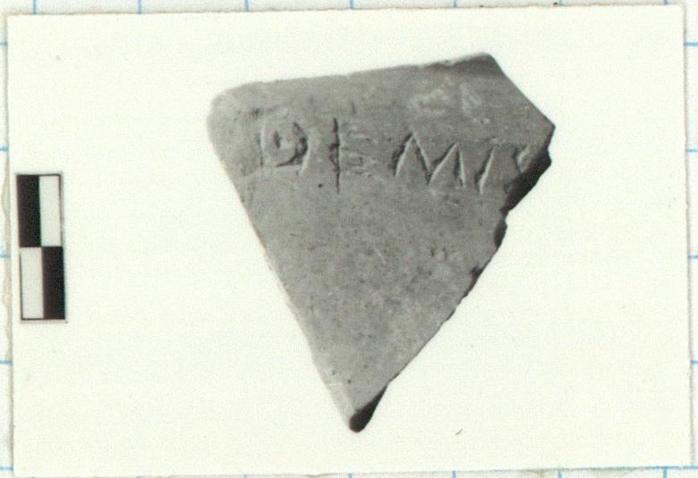 | Description: | Single wall fragment, broken all around, glazed on interior. Shallow ridge on the unglazed exterior above the inscription. Trace of red band (?) on uppermost corner of exterior. Four letters preserved: <graphic> Light pink fabric. | |