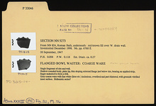 | Description: | Single fragment of rim and wall. Shallow rounded body, plain lip, thin sloping external flange just below rim, bearing an applied strip, finger-indented to form a frill. Gray coarseware with fine white (lime etc ) inclusions, overfired and part blistered, with greenish vitrified inner surface. Hellenistic series? | |