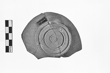 | Description: | Three joining fragments preserve whole of base and lower wall. Base of bowl(?) similar to P 33068. Flat, with low moulding at edge. Rounded lower wall. Three incised rings on bottom. Gray ware, as P 33068; slight darker wash on inside. Perhaps Asia Minor series, cf. Knidian. | |