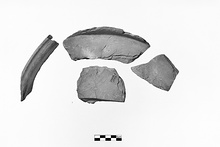 | Description: | Four non-joining fragments: a) floor to rim fragment, b) rim fragment, c) wall fragment and d) floor fragment. Flaking badly. Broad plain flat floor; low steep wall curving out to a thickened triangular overhanging rim, defined on top by a groove. Angle/offset on inside at base of wall, and a fine groove above. Low ledge-foot of normal type, with sloping inner face marked off by a small ridge at inner edge. Flaky brick-red clay with very fine mica flecks. Smooth red gloss, poorly preserved. Upper surface of floor badly scratched. Unclassified shape, copying early Italian sigillata. Eastern Sigillata B. | |