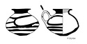 Description:   Intact except for one small chip in rim. Paint worn and flaking. Small one-handled type with sagging body, low neck, spreading lip, raised handle, and small flat base (off center). Decorated with intersecting looped bands on upper wall, and two bands on lower wall. Neck, handle, interior and exterior of rim painted.