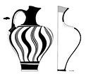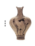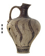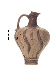 | Description: | Mended from many fragments (one loose fragment). Complete except for gaps on body. Dark brown paint well preserved, reddish where more dilute. Piriform shape with high, wide shoulder. Long tubular neck, cut away at back where handle attached and tipped forward for pouring in front. Flat sloping lip. Raised ring at base of neck, vertical ridged handle. Splaying (disc) foot, slightly concave below. Decorated with long curving stripes running vertically from shoulder to lower wall, one broad stripe alternating with group of three narrow stripes, framed by a band above and below. Wide band just above foot. Entire neck, inside of rim and exterior handle glazed. Ring of dots around shoulder at neck. Pale fine buff fabric with creamy slip on surface; dark brown paint. Addenda 2024: Fine light brown (7.5YR 6/4) fabric with gray core, as well as rare subangular small reddish-brown and dark gray inclusions. Argive. LH IIIA1 Early. Base has better parallels in LH II but motif does not begin until LH IIIA1 (e.g., RMDP I, p. 255). | |