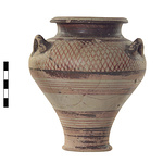 | Description: | Complete except for chips in rim and on body surface. Mended from many fragments. One handle (out of three) missing. Painted decoration well preserved but glaze worn and cracked where thicker. Piriform; broad out-turned sloping rim, low concave neck; high shoulder, tapering body, projecting ring foot. Horizontal looped handles, glazed. Neck glazed inside and out, with two reserved bands on rim, one under rim. Shoulder zone decorated with net pattern; below, thick band with four reserved lines. Below this, wide reserved area. Solid glaze around bottom of wall and foot, with four more reserved lines. Pinkish-buff fabric; red to brown glaze. Cf. for shape, see P 23534. Addenda July 2024: Four small joining fragments added from Lots ΒΕ 2410 and ΒΕ 2411. | |