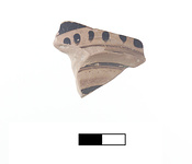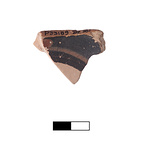 | Description: | Single fragment of lower wall and fillet above foot, broken all around. Reserved: band at base of wall with debased black glaze tongues with diluted glaze line below, flat fillet at junction of wall and foot and a wide band on underside with dilute line close to the foot. Added red: line on interior just above foot with drip mark slightly above line. On exterior reserved areas covered with wash. Fine orange fabric; dull black glaze. | |