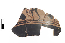 | Description: | Five joining fragments of wall. Black glazed lower wall; two black glaze lines above. Figural zone preserves back half of sphinx to left; female running right; between, legs of a male figure facing left. No incision. Added red dots on dress. Fine orange fabric; cloudy black glaze in the inside. Cf. P 33199, but smaller scale figures. CHC group. ca. 500 B.C. | |