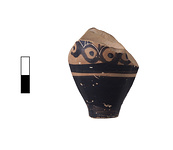 | Description: | Two joining fragments of lower body and wall; foot missing. Lower body black glazed with band above. On reserved area upright palmettes, with added red dots in center of circular hearts. Fine orange clay; shiny black glaze. Cf. P 1382: Hesperia 15 (1946), no. 182 | |