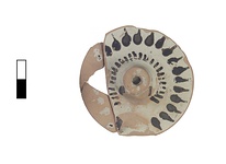 | Description: | Three joining fragments of neck, shoulder, and top of wall. Thin neck with narrow opening. Light offset at junction with shoulder. Rays and tongues on shoulder. Shoulder meets black glazed wall at sharp angle. White ground on neck and shoulder. Added red double line at top of wall. Fine pink-orange clay; dull black glaze. | |