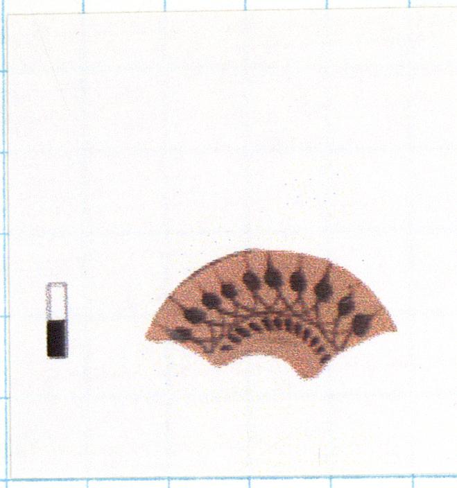 | Description: | Single fragment of shoulder and start of wall. Slight offset at junction with neck. Row of tongues and hanging lotus buds. Sharp angle at junction with wall. Wall black glaze with added red double line at top. Fine orange fabric; shiny black glaze. | |