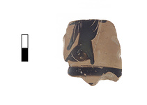 | Description: | Single fragment of wall, broken all around. Preserves draped female figure from neck down. Below, black glaze with reserve line. Hasty incision. Added white for flesh and drapery folds. Fine orange clay; dull black glaze. | |