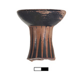 | Description: | Single fragment preserving mouth and neck. Glaze worn away on handle side, good elsewhere. Wide, flaring mouth with rounded lip, black glaze interior and exterior. Neck flares toward shoulder. Vertical rays on neck. Added red line at bottom. Orange clay; dull black glaze, shiny on neck. Phanyllis class. | |