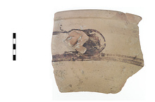| Description: | Single fragment of rim and wall with stump of one handle. Thickened, rounded rim; convex body, thick, round, up-turned horizontal handle. Glazed on interior, top of rim, two bands on exterior- above and below handle zone-exterior of handle. Fine orange clay, buff on surface; streaky orange-red to dark brown glaze. Cf. P 15093 (Agora XII, no. 1748) ca. 600-570 B.C. | |