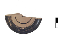 | Description: | One half preserved as single fragment. Glaze worn. Concave bottom. Round rim, thickened above, glazed on top. Reserved upper surface with two glazed circles. Underside reserved. Large white inclusions in otherwise fine pink clay. Inscribed on top: <graphic> Cf. P 992 (Agora XII, no. 1323 for shape). ca. 550 B.C. | |