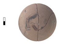 | Description: | Complete. Mended from five fragments. Worn on exterior. Rounded exterior, beveled rim with roughly finished vertical face. Traces of black glaze adhere to exterior surface. Interior surfaces have traces of light cream slip. Soft, powdery orange fabric with large white inclusions. | |