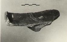 | Description: | Only a small segment remains. High base ring; low bowl; rim rolled inward. On the floor a broad circle of rouletting enclosing stamped palmettes, of which only one remains. Metallic black glaze. | |