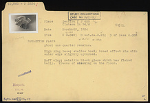 | Description: | About one-quarter remains. High ring base; shallow bowl; broad offset rim with outer edge slightly upturned. Buff clay; metallic black glaze which has flaked badly. Traces of stacking on the floor. | |