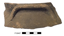 | Description: | Single fragment preserves one handle and ca. one-fifth of rim and upper wall. Sloping shoulder curving in at bottom. Straight outwardly inclined rim, flat on top. Slight flange for lid inside. Handle found in section, horizontally set on upper shoulder hugging wall. Hard, gritty fabric, reddish-brown (2.5YR 5/4) inside, brown (7.5YR 4/2) outside. Many sparkling inclusions, large voids. | |