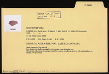 | Description: | Single fragment of rim and wall. Low sloping rim; shallow sloping floor, thickening towards missing foot. Brown clay, rather clean-breaking, purplish-brown semi-metallic slip all over, with polishing lines on interior. No decoration. Askra-Thespiai: Late Roman Ware | |