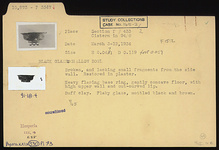 | Description: | Broken and lacking small fragments from the side wall. Restored in plaster. Heavy flaring base ring, gently concave floor with high upper wall and out-curved lip. Buff clay. Flaky glaze, mottled black and brown. | |