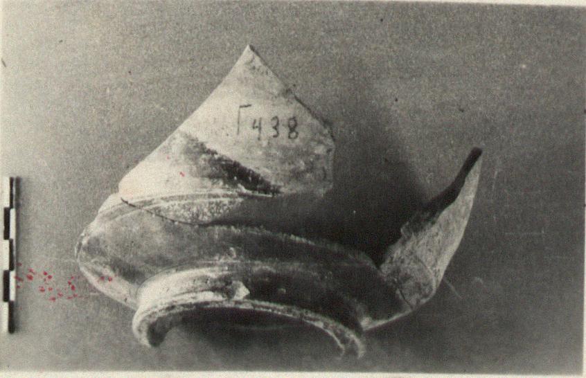 | Description: | Much of the side wall lacking; broken. All of rim missing. Heavy base ring; the upper wall slopes gently outward in a straight line; there is a slight indentation at the junction of floor and side wall. Scratched through the glaze and hard clay of the floor, a ligature: <graphic> Buff clay; metallic black glaze. | |