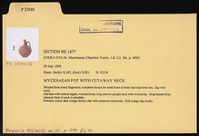 | Description: | Mended from many fragments; complete except for small holes in body and chip from rim. Slip very worn. Flat base with central nipple; rounded body; long narrow upright neck with everted lip. Strap handle from cutaway back of neck to shoulder. Powdery coarse dark orange-brown clay with numerous inclusions. Dull orange slip (wash). Addenda 2024: Fine yellowish red (5YR 5/6) micaceous fabric with small to medium rounded calcareous, quartz, and dark gray inclusions. LH II–IIIA. RMDP I, p. 89, no. 35, fig. 13:35, p. 203, no. 5, fig. 62:5, p. 255, no. 20, fig. 83:20. | |
