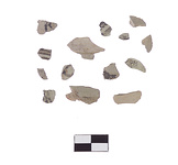 | Description: | Numerous joining fragments and a few small loose fragments preserve most of upper body, with two handles and complete rim. Missing entire lower part and one handle. Surface and paint cracking and peeling. Flat rounded shape; narrow at mouth, with broad out-turning lip. Upright loop handles. Dark brown paint for decoration. At belly, rock pattern above four bands. Wave decoration between handles. Painted on top of handles and interior and exterior of rim, except for reserved band under lip. Pale yellowish clay, buff on surface. Addenda July 2024: Six body fragments added from Lot ΒΕ 2411 | |