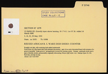 | Description: | Reused African red slip ware dish fragment. Roughly cut disc, with centering hole added underneath. Counter. From floor of a flat-based dish with stamped decoration: part of an outer decorated band with remains of a groove (possibly "triple groove" arrangement) toward the missing center. Stamps: quintuple circle and a pair of double circles, pressumably originally alternating (Hayes LRP style A iii. Stamps types 24, 28). Red clay, red slip on top. About AD 410-440? | |