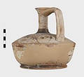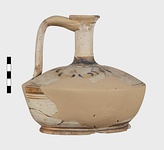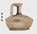 Description:   Parts are missing from the mouth and side wall. Low body, side wall meeting shoulder in an obtuse angle. Neck of medium height, flaring mouth. Strap handle doubly grooved. Band of black paint encircles the base ring and the lower part of the side wall. Around top of side wall is another broad band, with two lines below, and two lines on the shoulder above. Black band around root of neck and another around lip. On top of shoulder, four ribbons with tasselled ends tied in bow-knots to the root of the neck. In field, short black strokes. Traces of paint on back of handle and around point of attachment to neck.