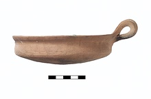 Description:   Missing half of body and slightly over half of rim. Rounded body with marks of wheel-trimming. Slightly inclined upper wall. Projecting rim with flange for lid on interior. Loop handle attached to rim.