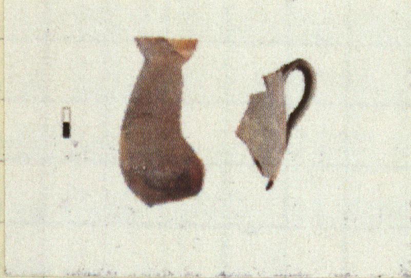 | Description: | Part mended into two large pieces from opposite sides. a) One-third of rim and section of body almost to base. b) Handle and part of body. Base lost. Low-bellied, with steep offset rim; thin handle, sliced down one side, from underside of rim to above belly. Slight "step" inside rim. No ribbing; faint belly-angle. Thin-walled orange ware, fired gray on outer surface, with some orange patches. Slight burning on a). Fine wheel-ribbing on inside. A rather large example of the normal Phocean 2nd century A.D. type. | |