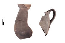 | Description: | Part mended into two large pieces from opposite sides. a) One-third of rim and section of body almost to base. b) Handle and part of body. Base lost. Low-bellied, with steep offset rim; thin handle, sliced down one side, from underside of rim to above belly. Slight "step" inside rim. No ribbing; faint belly-angle. Thin-walled orange ware, fired gray on outer surface, with some orange patches. Slight burning on a). Fine wheel-ribbing on inside. A rather large example of the normal Phocean 2nd century A.D. type. | |