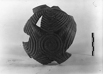 | Description: | Much of rim and side wall missing. In the medallion, a rosette with alternating petals and sepals. The side wall is occupied by four groups of concentric semicircles suspended from a raised line which constitutes the upper zone; between each group there is a jewelled line, forked at the top. Fine buff clay, thin black glaze somewhat flaked. | |