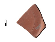 Description:   Single fragment, preserving one-quarter of base. Flat floor, upcurved wall, low thick foot. "Feather-rouletting" covering external wall. One groove on floor; no stamps.