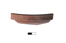 | Description: | Single piece of rim and upper wall. Sloping wall, thickening towards top; low heavy vertical overhanging rim with one row of coarse rouletting on outside, below a slight lip. Hard-fired clean-breaking dark red ware with thin slip over rim and inside; small lime particles. Exterior scratched from turning. Variant Phocean red slip ware, perhaps Grynnion series. For ware and treatment, cf. P 8648, etc. | |