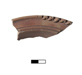 | Description: | Single rim fragment. Low sloping wall, flat rim with raised lip at edge and two grooves above inner edge. Row of notches, not continuous, executed with a combed implement on upper lip. Clean light yellow-tan clay, thin brown slip, patchy on exterior. L. R. light-colored ware. | |