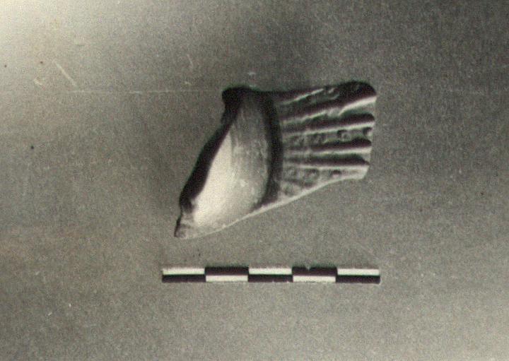 Description:   Fragment of neck and upper part of a small pitcher with slender neck; its body moulded and covered with vertical ridges. In every other channel is a line of tiny circles.